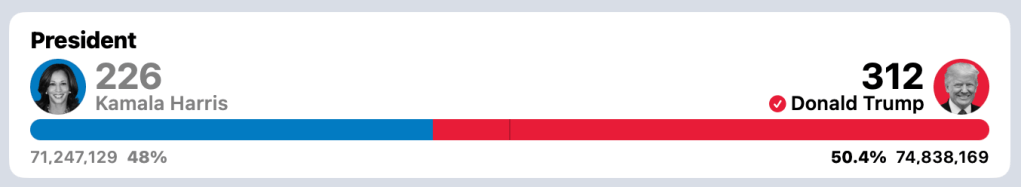 Trump once again has the Republicans in control of the House of Representatives and the Senate, as well as 6 Republican Supreme Court Justices. His policies include: a mass deportation of illegal immigrants and a pledge to secure the Southern border; increase tarriffs on everything, especially Chinese goods, probably starting a trade war in the process; staunchly supporting Israel instead of pushing for a two-state solution; achieve a peace ‘deal’ in the Russia-Ukraine war, allegedly within the first 24 hours of being elected (the clock is ticking); keep abortion rights with the states; deregulate businesses and provide tax-breaks for the ultra rich; and repeal Biden’s environmental policies. Trump is also skeptical of NATO and wants to reduce spending.