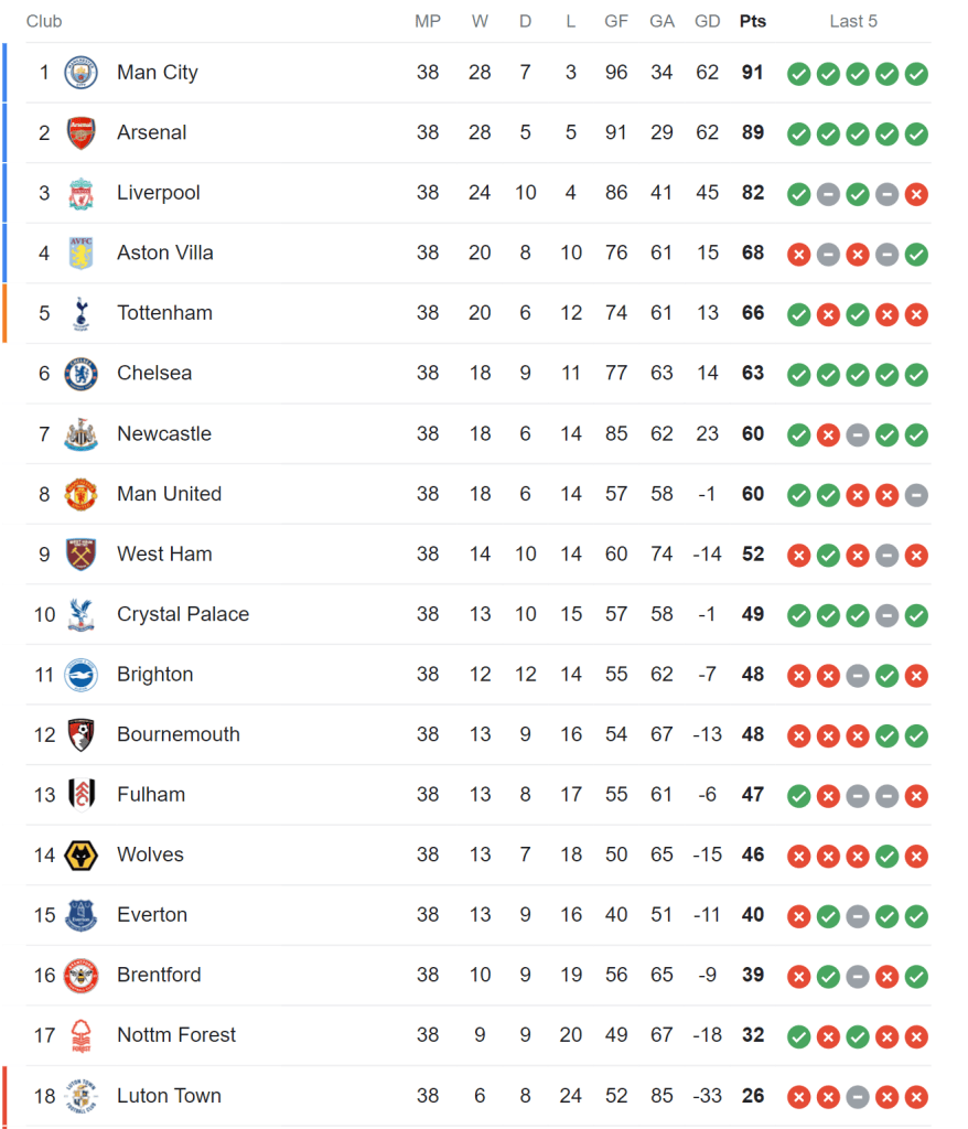 Arsenal finished 2nd place by just 2 points making the 23/24 season Arsenal’s best season in recent history. 2024 was by far its most impressive period, as it only lost 1 game in the premier league against Aston Villa.