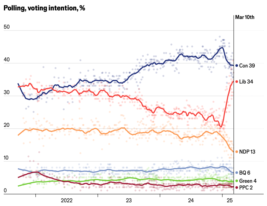 Before the leadership election, only 7% of Canadians had heard of this “rock-star banker.” The Liberals were deeply unpopular in Canada, with Justin Trudeau’s party polling terribly at 20%. The Conservative Party of Canada (CPC), led by right-wing populist Pierre Poilievre, had what was to be considered an unshakeable lead of 25 points and was widely expected to form the next majority government. Poilievre’s rhetoric has been compared to that of Donald Trump, and his message was clearly working.
